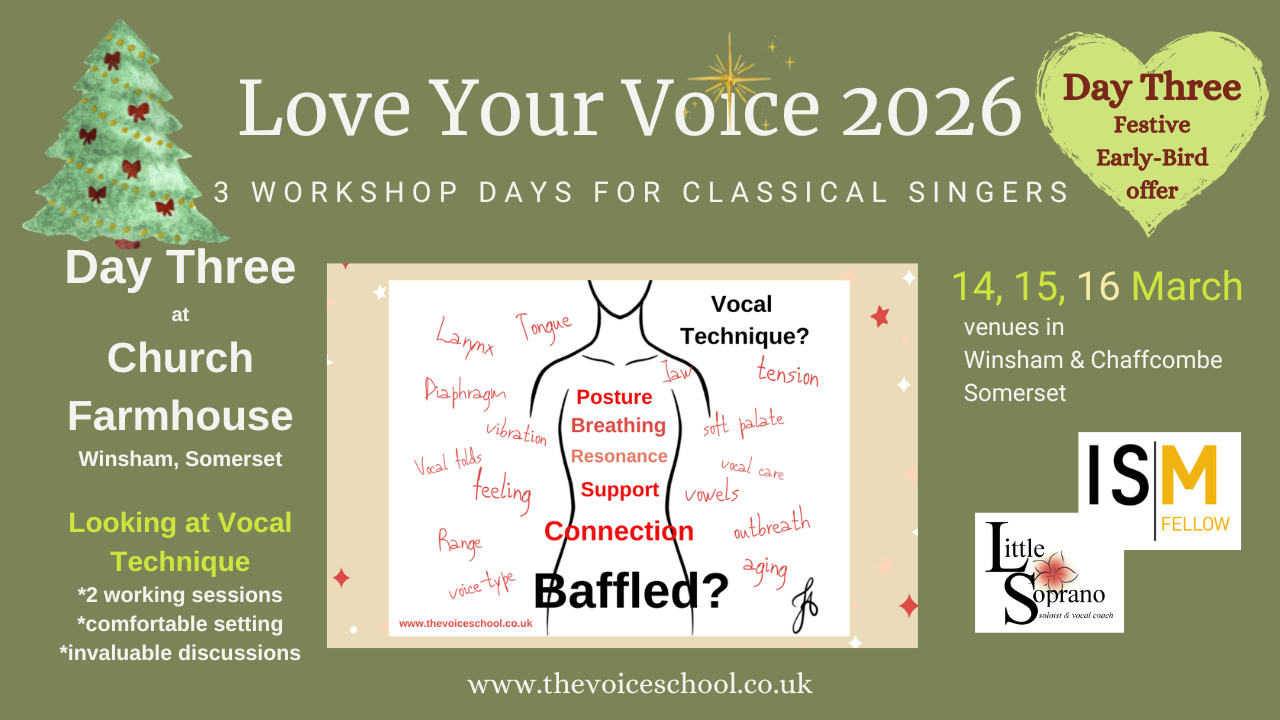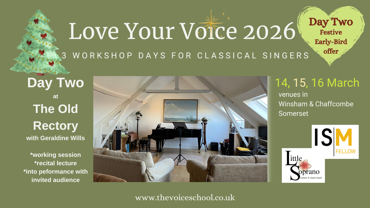 Love Your Voice 2026 will take place in Winsham, Somerset, UK, on 14–16 March. Now in its ninth year, this wonderful three-day workshop weekend for classical solo singers offers something different each day: a focus on artistry and expression, an opportunity to sing with an accompanist in a beautiful music studio, and a study day dedicated to your vocal technique. You can choose the day or days that suit you best, or come for all three.